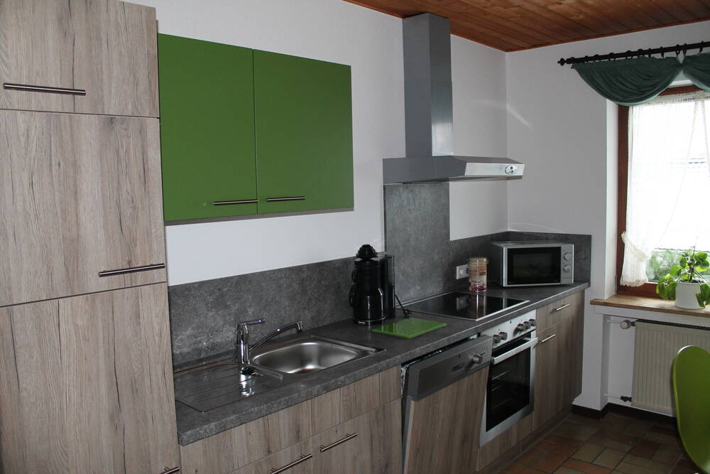 Die Küche ist ausgestattet mit Herd mit Dunstabzugshaube, Kühlschrank mit Gefrierfach, Mikrowelle, Spülmaschine und Spüle.